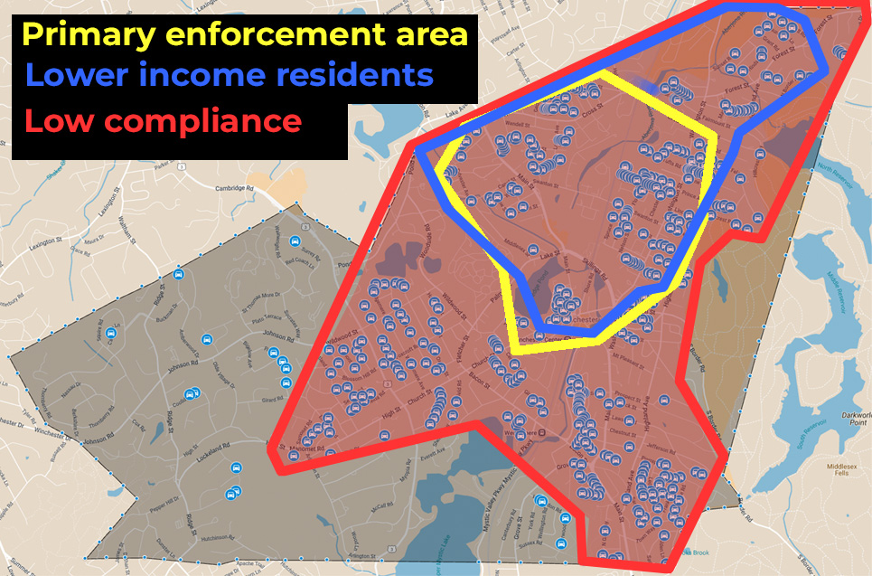 Most of the enforcement occurs on (1) main roads & (2) side streets in lower-income neighborhoods (closer to the Woburn line.) https://www.google.com/maps/d/viewer?mid=1QfDT3OKCf9TduPD6YEMkSKN7kd4H67o&ll=42.452836532792396%2C-71.14315303558253&z=14